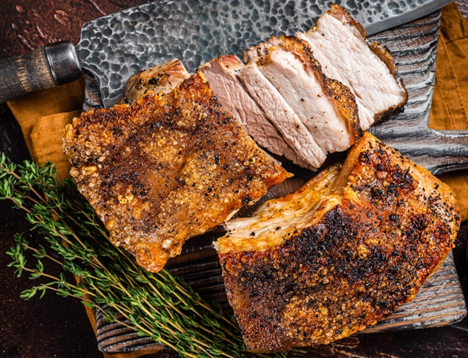 Termina el tocino Casablanca, colocando la piel hacia las brasas a alta temperatura para que quede bien dorado.